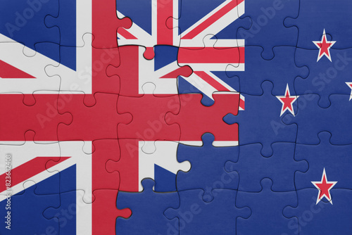 puzzle with the colourful national flag of new zealand and flag of great britain.