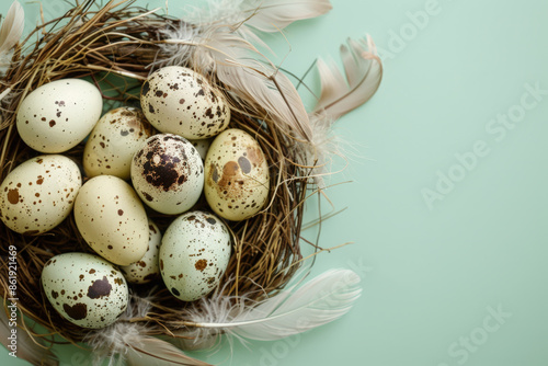 Quail eggs nestled in a cozy nest, feathers delicately arranged around, evoking a sense of natural beauty and tranquility