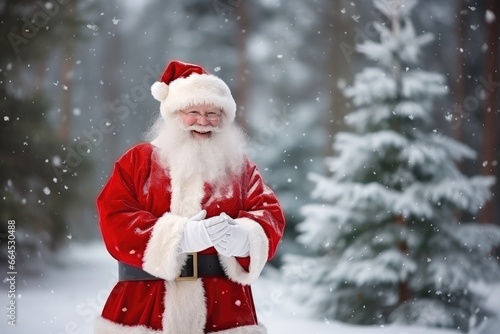 Quirky old bearded Santa Claus in the winter snowy forest. Winter holiday and Christmas concept. New Year's child frost.
