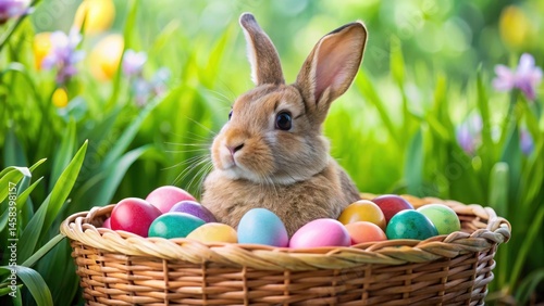 rabbit in colorful basket with decorated Easter eggs, egg decoration