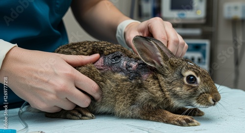 Rabbit Receiving Treatment for Injuries from Forest Fires - A rabbit is receiving care after suffering injuries due to forest fires. Compassion, healing, animal welfare, recovery
