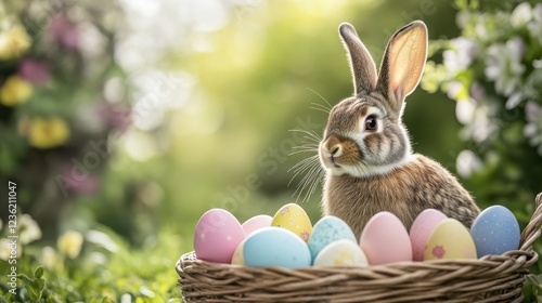 Rabbit sitting beside colorful Easter eggs in a basket outdoors, surrounded by flowers, symbolizing spring, celebrations, and festive traditions in nature.