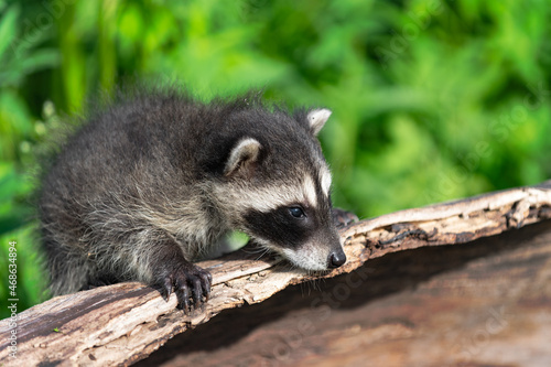 Raccoon (Procyon lotor) Hangs Over Edge of Log Close Up Summer