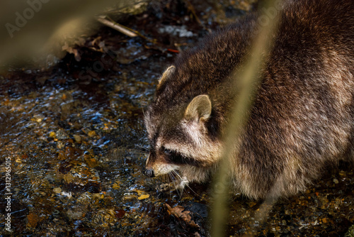 Raccoon, Procyon lotor, looking for food in water of forest brook. Also known as North American raccoon. Beautiful fur coat animal. Native to North America. Expansive species in Europe, Asia.