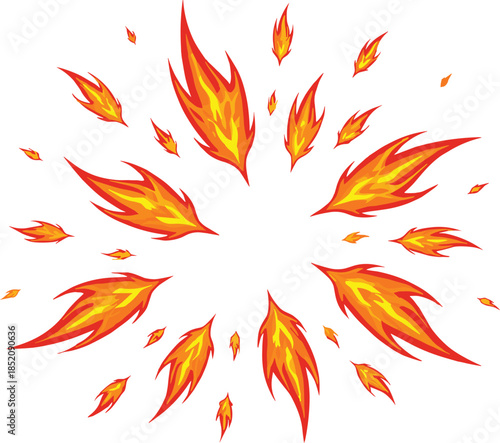 Radial Fire Explosion Effect With Flying Flame Sparks Isolated On White Background Flat Vector Illustration