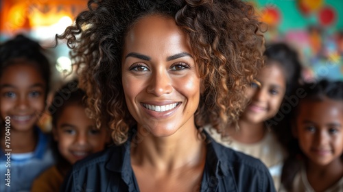 Radiant teacher smiling with diverse group of students in classroom