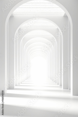 Radiant White Archway: A mesmerizing perspective of a long corridor of pristine white arches, bathed in soft, ethereal light, creating a sense of depth, serenity, and endless possibility.