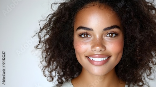 Radiant young African American woman with natural curly hair smiling widely and posing enthusiastically against a simple white background conveying a sense of excitement and positive energy
