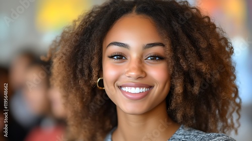Radiant Young Woman with Voluminous Curls: A Portrait of Joy