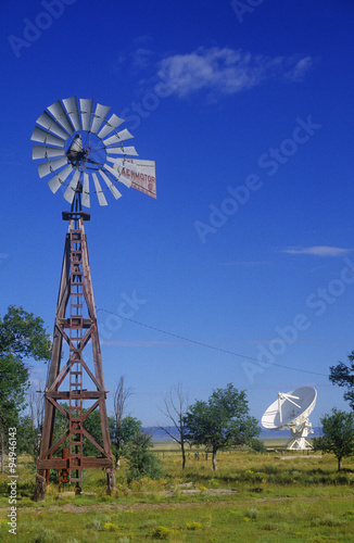 Radio telescope and old windmill at the National Radio Astronomy Observatory in Socorro, NM
