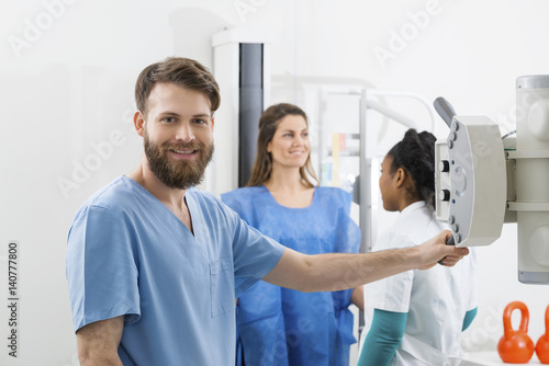 Radiologists Preparing For X-ray Over Female Patient In Hospital