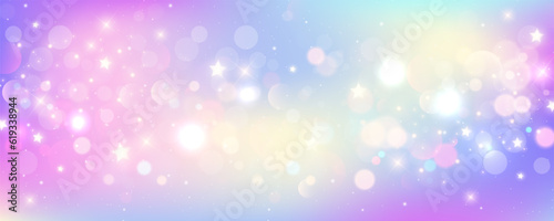 Rainbow unicorn background. Pastel fantasy sky with bokeh and stars. Magic holographic galaxy. Marble kawaii texture. Vector cosmic girlie wallpaper.