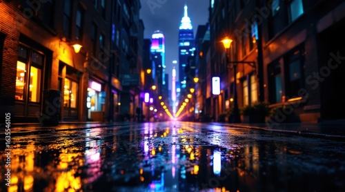 Rainy city street at night with neon reflections