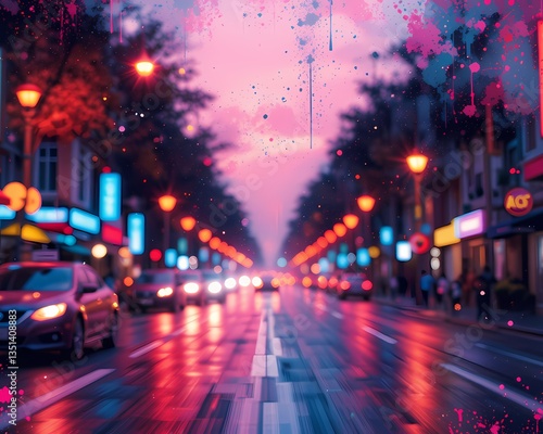 Rainy Night City Street Lights, Blurred city street at night with rain and colorful lights.
