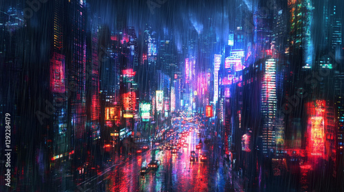 Rainy weather in night city street with neon lights. Vector cartoon illustration of rainfall in modern megalopolis with shops, apartment buildings. Windows of skyscrapers glowing in different colors