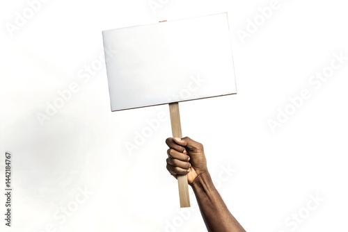 Raised arm holding up a blank sign, dark skin tone, against a pure white background