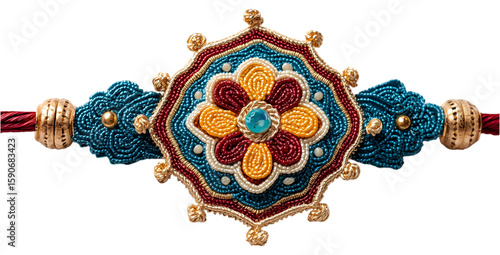 Rakshabandhan. colorful, intricately designed Rakhi with central floral motif in gold, red, and blue, isolated on transparent background. PNG, cutout. Rakhi features detailed embroidery and beadwork.
