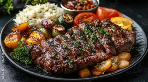 Ramadan Eid Mubarak Celebration Roasted Lamb Dish with Grilled Vegetables and Rice on Dark Background Culinary Artistry Close Up