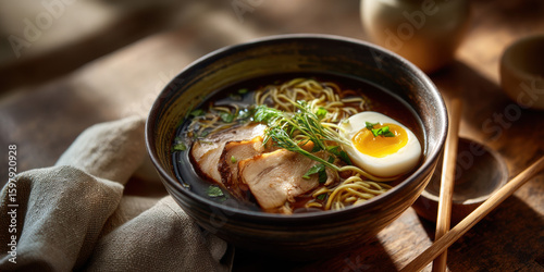 Ramen bowl with sliced pork, soft boiled egg, noodles, and fresh herbs served on wooden table with chopsticks