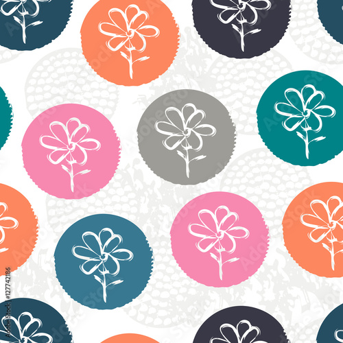 Random pink, orange, blue, gray textured polka dot with flowers inside on white. Doodle seamless pattern with creative circles. Floral background with grunge texture. Vector illustration.