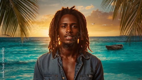 Rastaman standing in front of the vibrant turquoise Caribbean sea in Jamaica, with the sun setting behind him, casting a warm golden silhouette of his dreadlocks and worn denim clothing