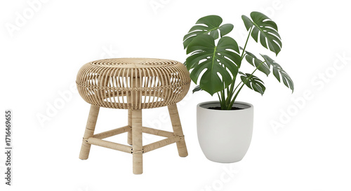 Rattan stool and monstera plant in white pot isolated on transparent background