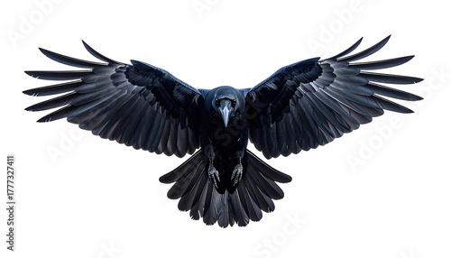 Raven soars, wings spread wide against a black background