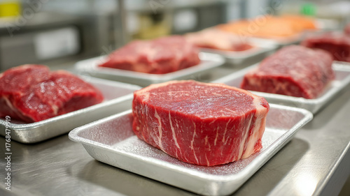 Raw beef steak on a tray in a professional kitchen.