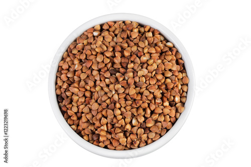Raw buckwheat in ceramic bowl isolated on white background. Top view. Flat lay