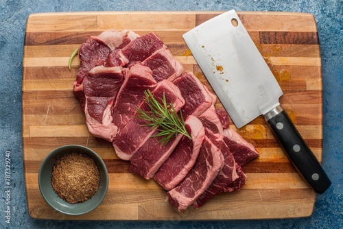 Raw flank steak on a cutting board with a meat cleaver ready to be marinated