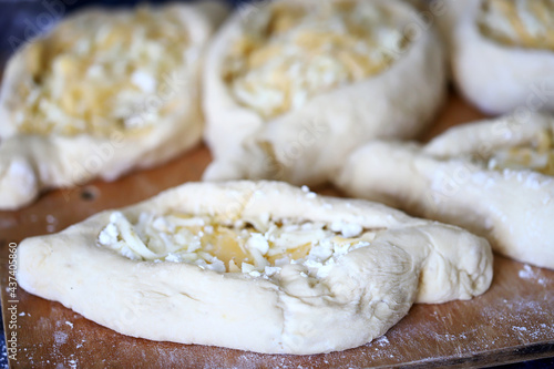 Raw khachapuri on a wooden board. Cooking homemade khachapuri.