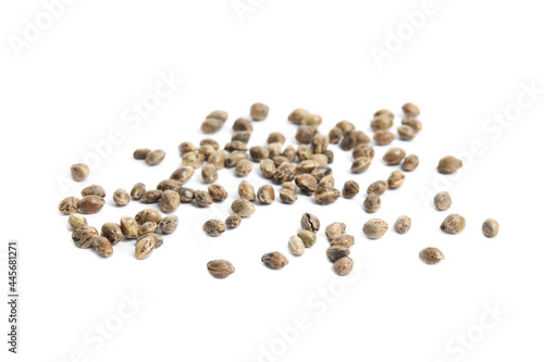 Raw organic hemp seeds on white background