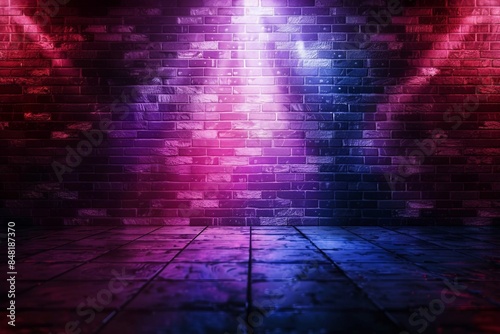 Rays neon light on neon brick wall. Empty scene background. generative ai.
