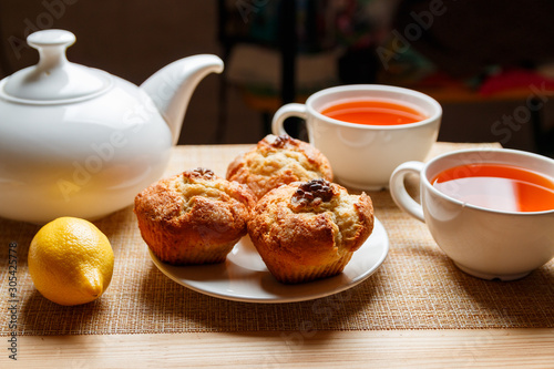 ready breakfast with muffins and lemon tea for two