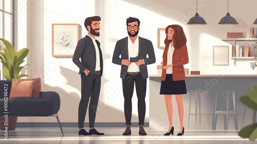 real estate agent presenting a new apartment to a couple, offering insights on housing market trends and home buying tips