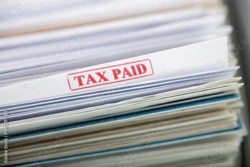 Real Estate Tax Deal Stack of documents with a "TAX PAID" label prominently displayed on top.