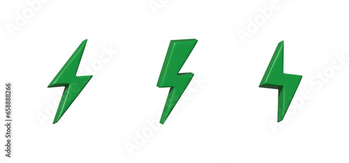 Realistic 3D green Lightning bolt icons different angel collections, electric power symbol transparent background.