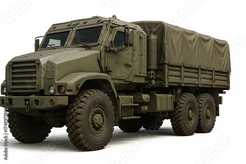 Realistic 3D Heavy-Duty Armored Military Transport Truck Isolated on White Background