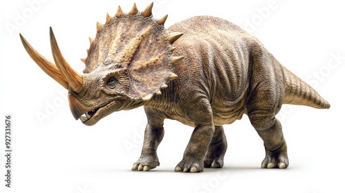 Realistic 3D rendering of a triceratops dinosaur with three horns and a frilled neck, isolated on a white background.