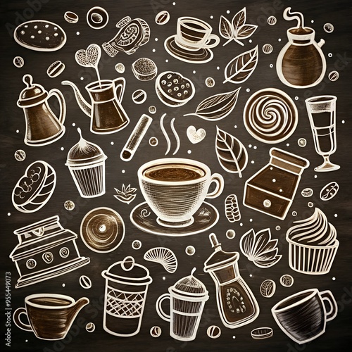 realistic coffee background with household items for making fragrant coffee circled with a white marker on a black background.