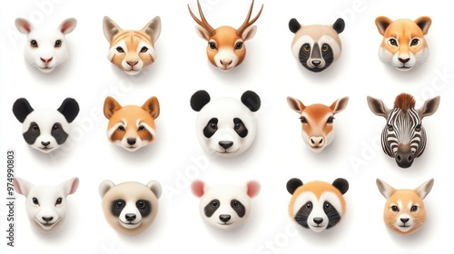 Realistic colorful animal faces, including panda face, rabbit head, dog nose, pig ears, cow horns, sheep eyes, fox tail, monkey smile, lion mane, tiger paw etc