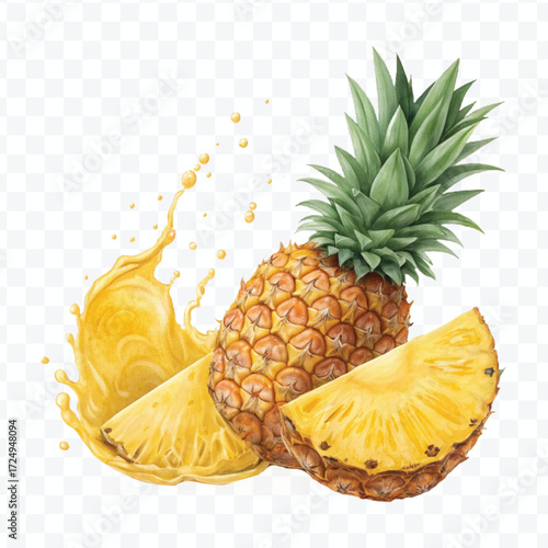 realistic delicious pineapple and slice with yellow juice splash in different style isolated on transparent background
