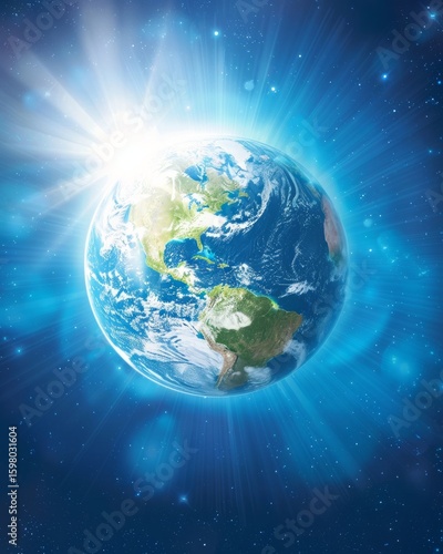 Realistic Earth globe with ozone layer shield and sun rays deflected, clean air and climate change theme, digital illustration