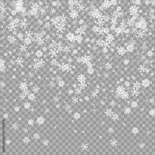 Realistic falling white snow overlay on transparent background. Snowflakes storm layer. Snow pattern for design. Snowfall backdrop texture. Vector illustration