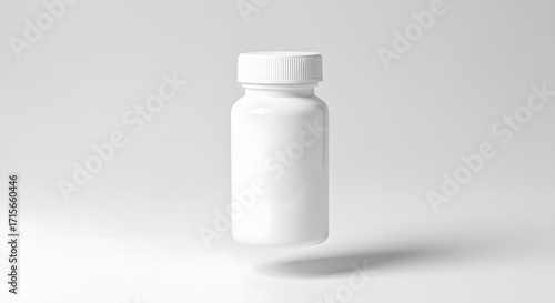 Realistic floating white plastic pill bottle mockup with blank label on clean background, perfect for medical, supplement, and pharmaceutical product branding and commercial design.