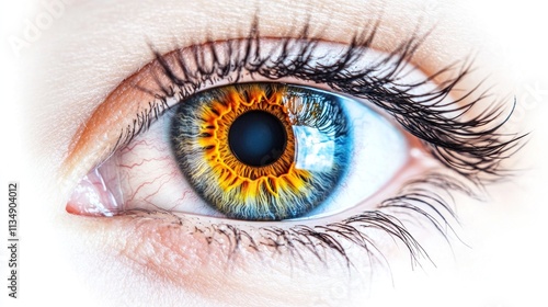 Realistic human eye model with bright, striking iris and intricate veins, isolated on a pristine white background.