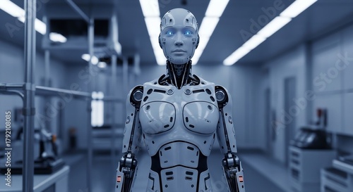 Realistic humanoid robot standing in a high-tech laboratory with blue lighting, representing artificial intelligence and advanced robotics technology.