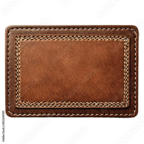 realistic leather label patch rectangular brown leather tag with detailed stitched border soft natural leather texture high resolution close up view isolated on white background no sha