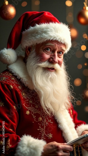 Realistic, New Year’s Eve 2025 Banner, A banner design with elegant gold and white colors, featuring Santa Claus and ornaments, confetti with copy space, vertical orientation.