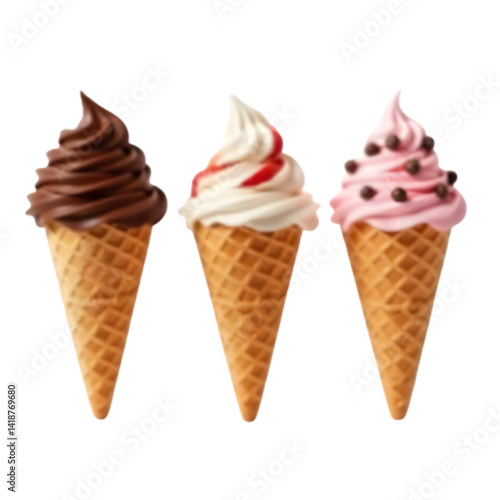 Realistic Soft Serve Ice Cream Cones Trio – Chocolate, Vanilla with Strawberry Bits, and Strawberry with Chocolate Chips on Waffle Cones, Isolated on Transparent Background